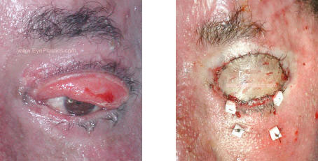 Lubrication, surgery (skin graft for vertical elongation)   Photographs below show a patient who sustained SEVERE facial burns, with resultant cicatrical changes, complete eversion of the left upper eyelid with scarring of the lid margin/lashes to the area of the eyelid crease